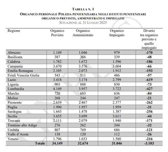 Il divario di 3.103 unità riguarda unicamente il personale della Polizia Penitenziaria che opera all’interno delle strutture penitenziarie. Considerando il totale generale del personale di Polizia Penitenziaria, si nota un divario di 1.036 unità. La differenza tra 3.103 e 1.036 indica il numero delle persone che lavorano in altri servizi o uffici del DAP. L’analisi sopra riportata evidenzia una massiccia presenza di personale impiegato in servizi centrali, uffici amministrativi e strutture non detentive.