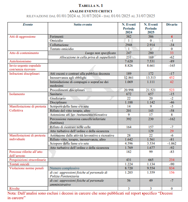 Un’analisi degli eventi critici fornisce un quadro dettagliato della tensione sociale all’interno del sistema penitenziario. Dal 1 gennaio 2025 al 31 luglio 2025 si sono verificati 94.421 eventi critici, sottolineando la tensione costante con la presenza di eventi quotidiani multipli.
