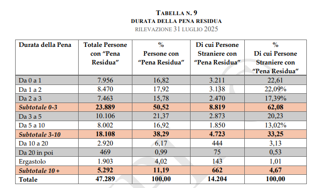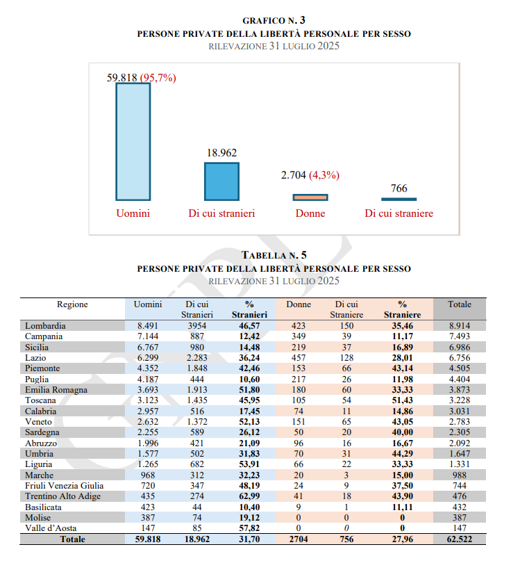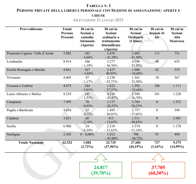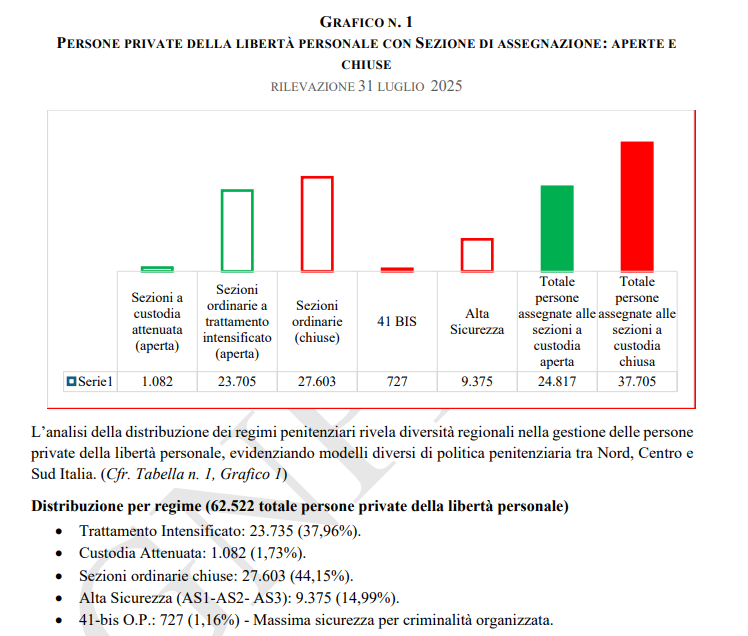 Al 31 luglio 2025, il numero totale dei detenuti presenti nel sistema penitenziario italiano era di 62.522, di cui l’1,73% in Sezioni a custodia Attenuata (Aperta), il 37,96% in Sezioni ordinarie a trattamento Intensificato (Aperta), il 44,15% in Sezioni Ordinarie (Chiuse), l’1,16% in Sezioni 41 bis e il 14,99% in Sezioni Alta Sicurezza.