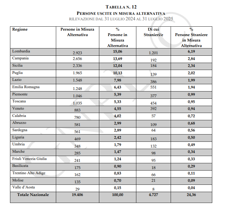 Tra luglio 2024 e luglio 2025, le persone uscite in misura alternativa sono state 19.406 (di cui 4.727 stranieri). La Lombardia presenta i dati migliori, con 2.923 uscite, di cui 1.201 stranieri. La Campania ne presenta 2.656, di cui solo 192 stranieri; la Sicilia 2.336, di cui 184 stranieri e la Puglia 1.965, di cui 139 stranieri. Mentre le regioni del sud presentano elevati volumi assoluti di uscite, i dati dimostrano percentuali molto basse di stranieri usciti. D’altra parte, le regioni del centro-nord presentano la percentuale più alta di stranieri usciti in misura alternativa.