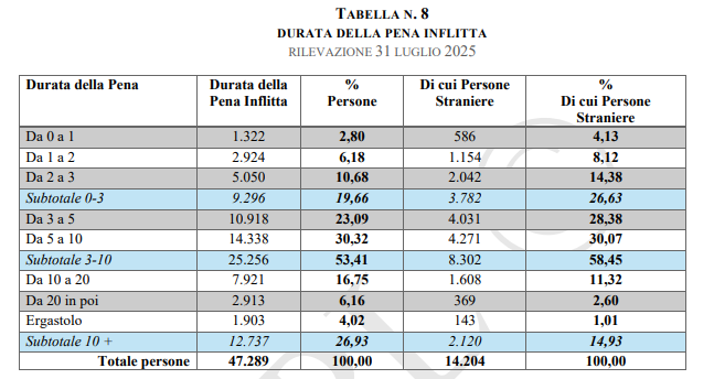 Riguardo alla durata delle “pene inflitte” (durata delle pene dei detenuti condannati in via definitiva) nel sistema giudiziario italiano, il Report riporta che le pene brevi (0-3 anni) rappresentano il 19,66% del totale, le pene medie (3-10 anni) il 53,41% del totale, mentre le pene lunghe (oltre 10 anni) il 26,93% del totale.