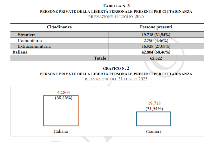 Nell’analisi del sovraffollamento in carcere in Italia, il Report distingue tra “persone presenti in archivio” (numero di detenuti presenti nelle strutture al momento della scrittura del report), “capienza regolamentare” (capienza massima teorica dell’istituto penitenziario secondo le norme tecniche ed architettoniche) e “posti regolarmente disponibili” (quanti posti della capienza regolamentare sono effettivamente utilizzabili in un dato momento). Confrontando una serie di dati raccolti, l’analisi individua un indice di sovraffollamento totale nazionale del 133,68%. Il numero delle persone private della libertà personale al 31 luglio 2025 era di 62.522, con 51.300 posti di capienza regolamentare e 46.769 posti regolarmente disponibili.
