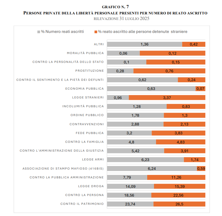 Analizzando i reati commessi, in Italia, i reati contro il patrimonio rappresentano la categoria più numerosa della distribuzione delle persone private della libertà personale per tipologia di reato, con in totale 35.885 persone private della libertà personale (23,74% del totale). Questa tipologia di reato è la più diffusa sia tra i cittadini italiani, sia tra quelli stranieri (10.445 individui stranieri, rappresentando il 26,50% dei reati patrimoniali). Si può attribuire questo elevato numero di reati contro il patrimonio da parte di stranieri a dinamiche socio-economiche. La sovrarappresentazione straniera si può trovare anche nei reati contro la pubblica amministrazione, reati specifici dell’immigrazione e la prostituzione. D'altra parte, i reati con una sottorappresentazione straniera includono l’associazione mafiosa, i reati relativi alle armi e reati contro l’amministrazione della giustizia.