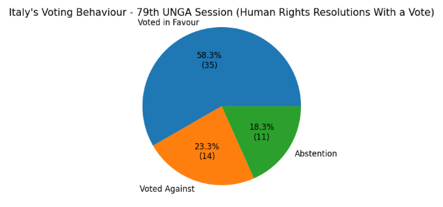 Moreover, Italy sponsored 16 resolutions concerning human rights and participated in recorded votes on 60 resolutions, casting 35 votes in favour, 14 against, and 11 abstentions. The results of these votes are illustrated below.