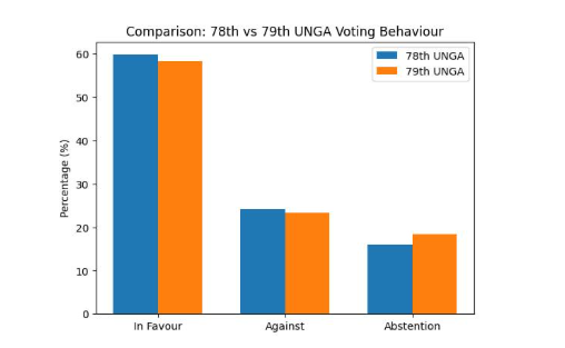 During the seventy-ninth session of the General Assembly (2024–2025), the UNGA adopted a total of 334 resolutions. Of these, 223 resolutions were adopted without a vote, reflecting consensus among Member States, while 111 resolutions were adopted with a recorded vote, allowing for the identification of individual State positions. These resolutions include a wide range of concerns such as sustainable development, the impact of Artificial Intelligence, peace and security, self-determination, etc.