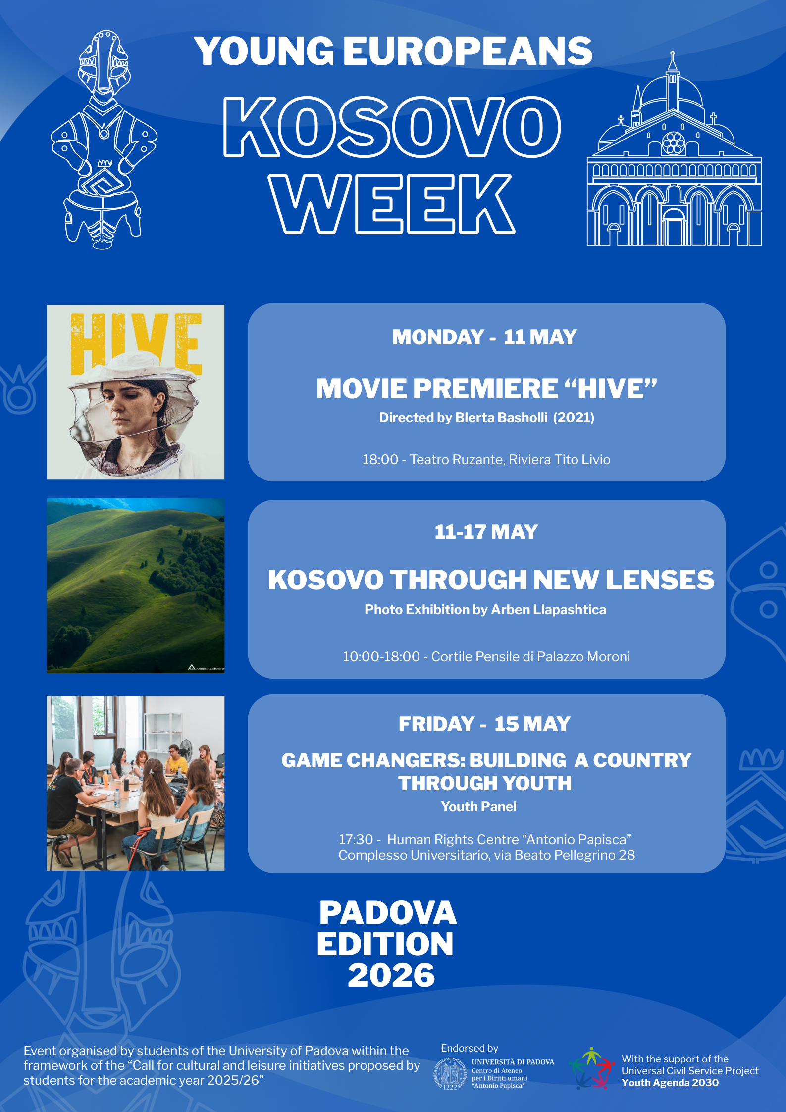 Dall’11 al 17 maggio 2026, la città di Padova ospiterà Young Europeans: Kosovo Week – Prima edizione, un’iniziativa culturale promossa da un gruppo internazionale di studenti dell’Università di Padova, con il patrocinio del Centro di Ateneo per i Diritti Umani “Antonio Papisca” e il supporto delle operatrici e operatori del progetto di servizio civile universale "Youth Agenda 2030". L'iniziativa è