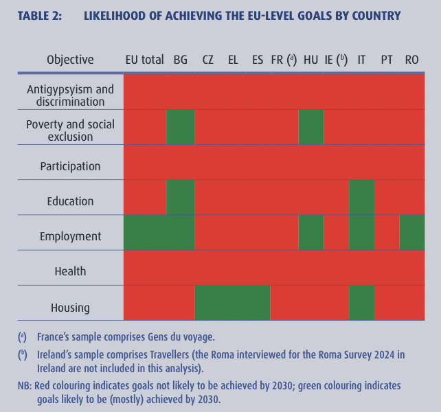 Per quanto riguarda gli obiettivi a livello UE stabiliti dal Quadro Strategico dell'UE, la probabilità di un loro ampio raggiungimento non è promettente. Tra tutti i paesi oggetto dell'indagine, Bulgaria e Italia sono previste raggiungere il maggior numero di obiettivi. Nel caso dell'Italia, questi sono nelle aree dell'istruzione, dell'occupazione e dell'alloggio, come si può osservare più in dettaglio nella seguente tabella estratta dal rapporto dell’indagine Rom/nomadi 2024: